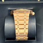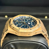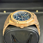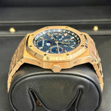 Explore the pinnacle of watchmaking artistry with the Audemars Piguet Royal Oak Perpetual Calendar, an exceptional luxury timepiece tailored for the discerning connoisseur. This renowned model, reference number 26574OR.OO.1220OR.02, marries the beauty of a blue dial with the sophistication of a fixed bezel, meticulously crafted in rose gold, showcasing an unmistakable aura of opulence. The 41mm case, together with its integrated bracelet, both made from high-quality rose gold, ensures enduring elegance and comfort. Powered by a precise automatic movement, this pre-owned masterpiece is perfect for those who appreciate both form and function.